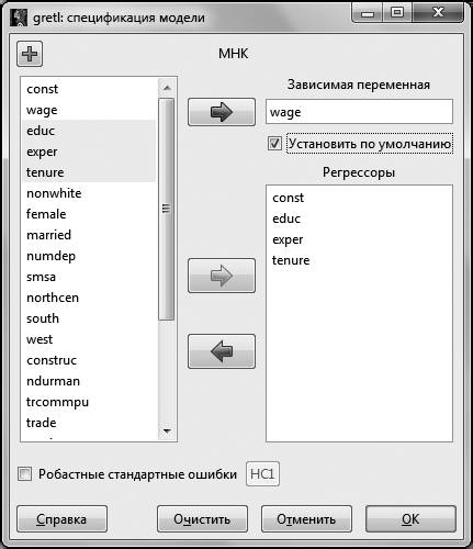 Для дальнейшего удобства можно поставить галочку в окошке Установить по умолчанию. Это делается для того, чтобы при изменении спецификации исследуемой модели зависимая переменная не менялась. В окно Регрессоры отправляем регрессоры модели – это переменные