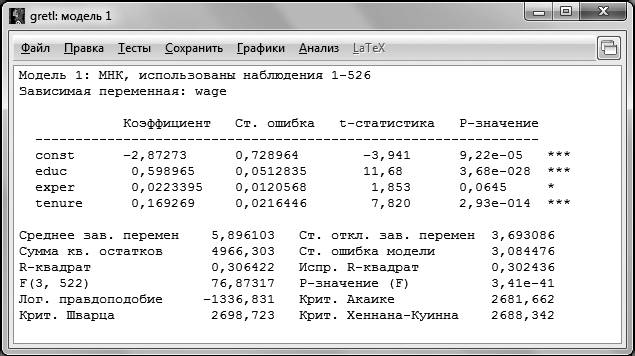 Уровень значимости, на котором принимается решение о том, какую гипотезу не отвергать, остается на усмотрение исследователя. Как правило, если нет представления, какой именно уровень значимости брать, предлагается выбирать 5 %. В случаях работы с маленьким по объему выборками (от 30 до 100 наблюдений) предлагается брать уровень значимости 10 %. Для больших выборок (более 1000 наблюдений) можно взять уровень значимости 1 %. В нашем случае объем выборки средний (526 наблюдений, эта информация дана в первой строке распечатки на рис. 2.2.), поэтому можно было принять