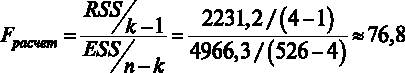 Для начала проверим гипотезу о незначимости регрессии в целом. Тест позволит понять, является ли построенная модель адекватной с точки зрения статистики. Для этой цели воспользуемся тестом Фишера [3].