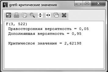 Тест Фишера можно провести также в полуавтоматическом режиме и в автоматическом режиме. Полуавтоматический режим состоит в том, что нам не нужно вручную вычислять значение расчетной F-статистики, оно дано в распечатке на рис. 2.2. В этом случае нужно лишь выяснить критическое значение F-статистики и сравнить расчетное значение с критическим.