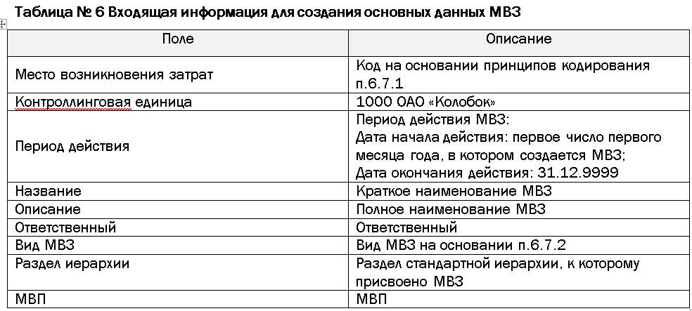 Входящая документация: заявка на создание основных данных МВЗ