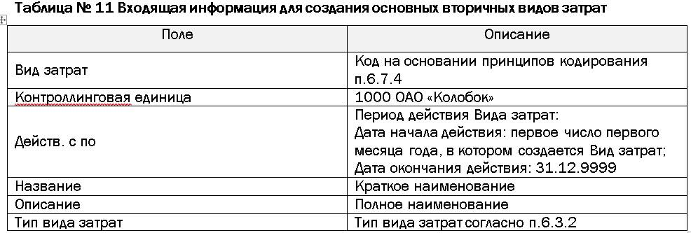 Входящая документация: заявка на создание основных данных вторичных видов затрат.