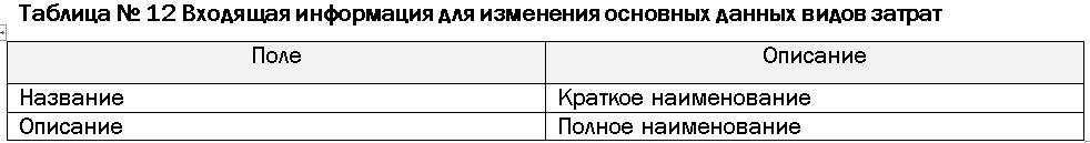 В основной записи видов затрат возможно изменение следующих данных: