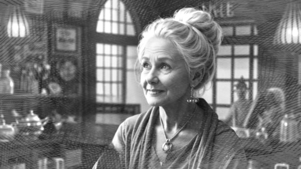 Пока девушки украдкой следили друг за другом разглядывая артефакты на полках, они не заметили, как из полутени за прилавком появилась женщина и привлекла их внимание. Её возраст было трудно определить. У неё длинные седые волосы, собранные в аккуратный пучок, и спокойные, проницательные глаза, словно она видит их насквозь. На ней простое, но изящное платье в старинном стиле, а на шее ожерелье с множеством амулетов, подчёркивающие её связь с чем-то древним.