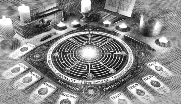 Старушка внимательно посмотрела на каждую из девушек, словно ожидая их следующего шага. Она медленно достала из коробки несколько небольших красных мешочков и разложила их на столе. Затем вынула чёрную ткань с золотым тиснением и аккуратно развернула её. На полотне был изображён лабиринт – переплетающиеся пути, ведущие к центру, где находилась главная точка – «МИССИЯ ДУШИ». Дороги лабиринта проходили через пять ключевых сфер, каждая из которых символизировала важные аспекты жизни: