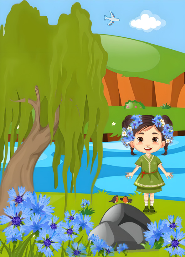 Возле ивы у рекиРаспустились васильки.Ива длинными ветвямиНежно гладит лепестки.В косу я цветок вплету,Близко к иве подойдуИ скажу ей: «Ива, ива,Посмотри, как я красива!»