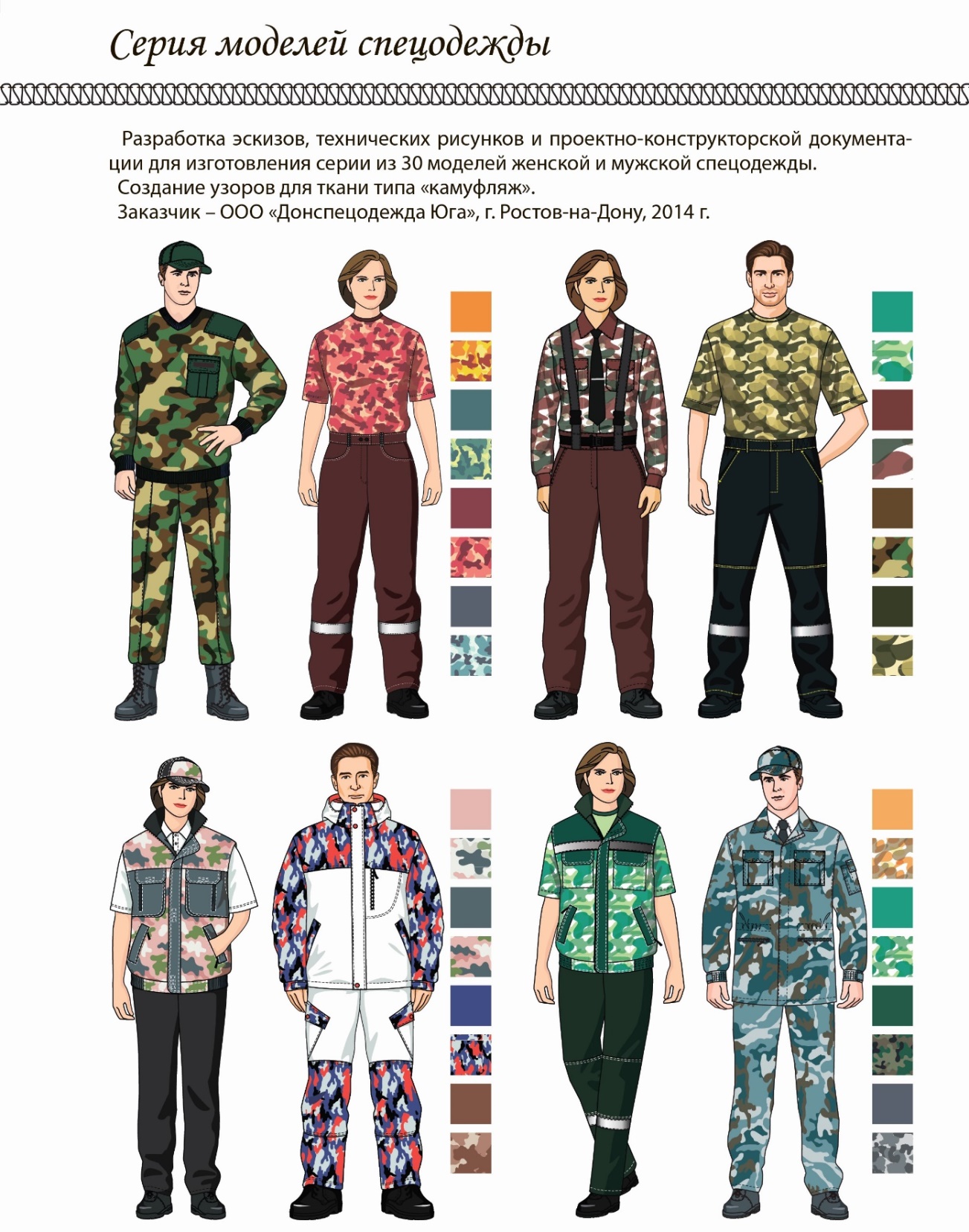 Рисунок 1.1 – Образцы эскизов одежды и использованием рисунка ткани камуфляж