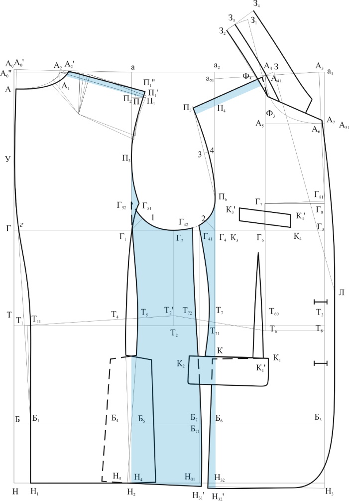 Рисунок 1.14 – Чертеж модельной конструкции пиджака с обозначением «невидимой зоны» голубым цветом