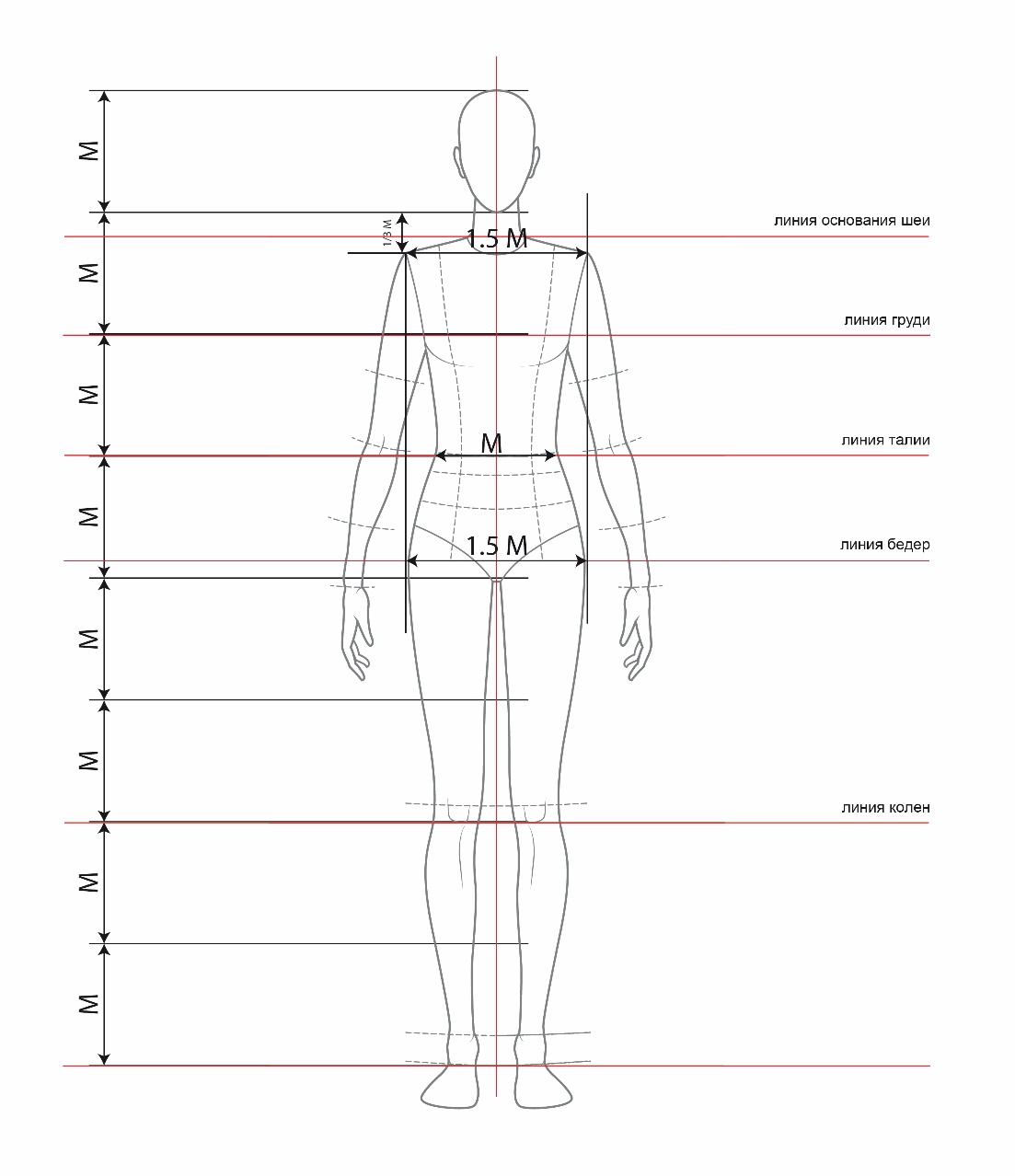 Целесообразно размещение вспомогательных и информационных линий – уровней талии, груди, бедер и т д. Относительно перечисленных линий и через контрольные точки можно проводить дополнительные линии для разметки технического рисунка и измерения геометрических параметров готового изделия. Уровень линии плеч располагают на расстоянии 1/3 М от подбородка. Ширина фигуры по линии талии равна одному модулю – М. Ширина женской фигуры по линии бедер составляет 1,5 М. Уровень линии локтя находится на уровне линии талии, а уровень запястья на уровне линии бедер. Опущенная вниз рука равна примерно трем размерам головы, а средний палец достигает середины бедра. Длина голени со стопой равна примерно 2М. На рисунке 1.17 представлен шаблон женской фигуры с учетом указанных пропорций.