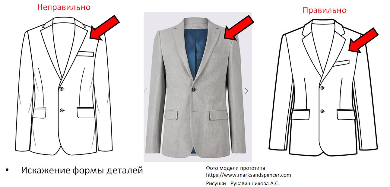 Существует расхождение между истинной величиной и формой деталей, размером на фотографии. Бывает очень сложно определить пропорции и положение конструктивных линий, размеры деталей, их ориентацию относительно друг друга. При выборе фотографии одежды следует обратить внимание, что модели могут изображаться не только во фронтальной плоскости, но и в других ракурсах, что приводит к искажению линейных и угловых параметров одежды. На рисунке 1.20 слева представлен технический рисунок пиджака, обрисованный по контуру фотографии изделия. Он получился с искажением формы, пропорций, наклона деталей (воротника, лацкана, верхнего кармана, талиевых вытачек). Справа на рисунке 1.20 – технический рисунок, нарисованный самостоятельно по шаблону фигуры.