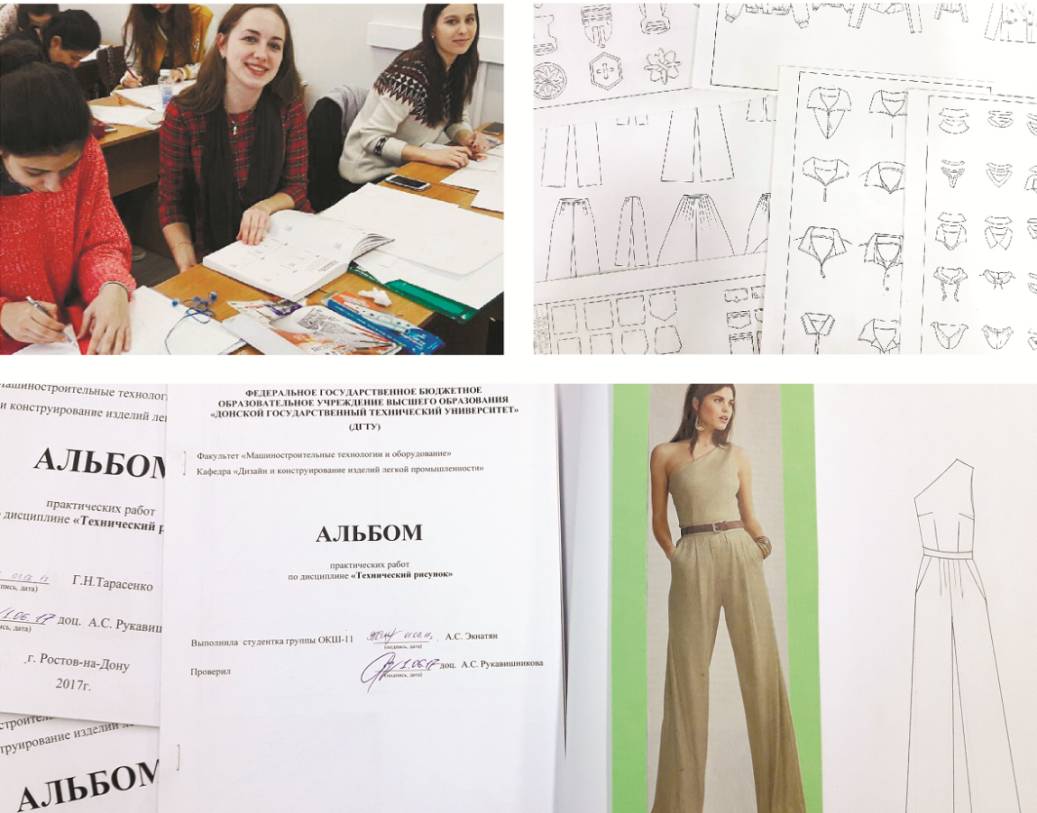 Рисунок 1.4 – Вверху на фотографии студенты 1 курса направления «Конструирование изделий легкой промышленности» во время практических занятий по дисциплине «Технический рисунок», внизу – работы студентов: альбомы технических рисунков, выполненных от руки