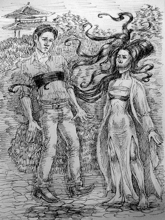 К ней приблизилась неизвестно откуда взявшаяся, но очень красивая девушка с высокой причёской, в синем кимоно, разрисованном какими-то диковинными цветами и животными. Заметной частью её лица был очаровательный маленький ротик, но обольщаться её красотой я, уже наученный горьким опытом, не спешил, так как понимал, что передо мной, скорее всего, очередная замаскированная ёкай.