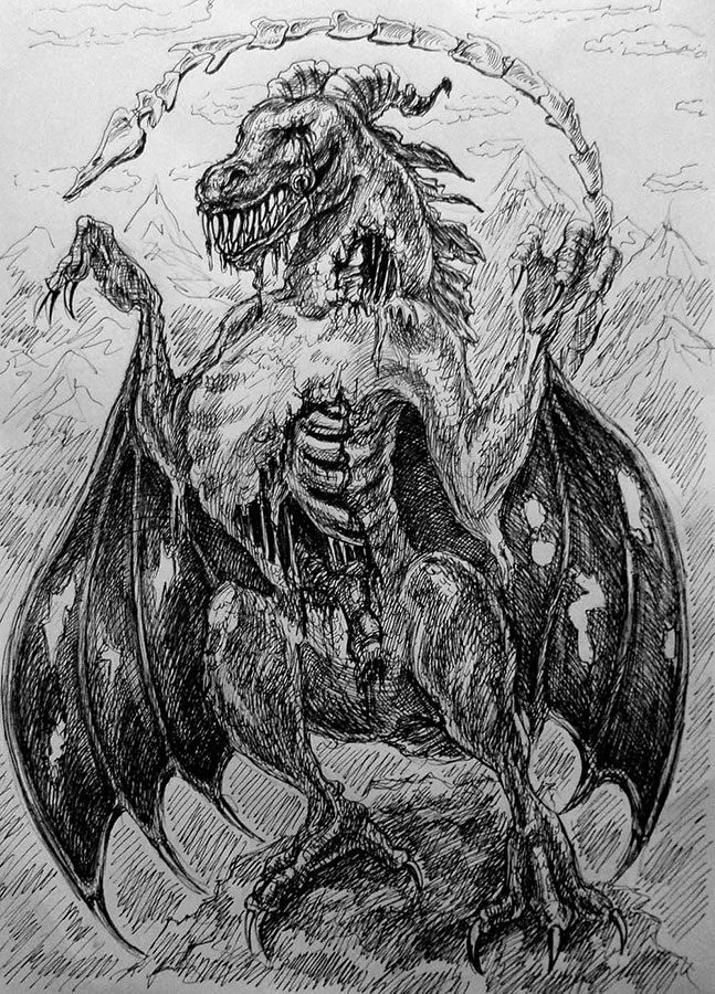 Пустые глаза, один из которых свисал из глазницы на лоскуте нерва, ничего не выражали. Чешуйчатая шкура местами прогнила, обнажая тронутые тлением внутренние органы и пожелтевшие кости скелета. Крылья у него росли не на спине, как это любят показывать в кино, они больше походили на летучемышиные и были продолжением его верхних конечностей. Пахла ящерка так, что слезились глаза и к горлу подступала тошнота. И ещё добавьте ко всему этому, что вся эта «красота неземная» надвигалась на нас ломаной походкой робота…