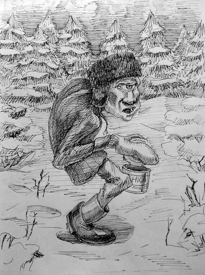 Когда скромный ужин был окончен, Одуванчиков заметил яркое фиолетовое пятно, которое приближалось к нашему импровизированному лагерю, увеличиваясь в размерах до тех пор, пока не превратилось в человечка с одной ногой, обутой в валенок с галошей, с единственной рукой в лимонно-жёлтой вязаной варежке. Данная конечность росла прямо из его груди. На голове, завёрнутой в шапку-ушанку из цигейки, размещался один-единственный глаз. Ростом чудик был сантиметров пятьдесят и имел обыкновение передвигаться прыжками (а как ещё, учитывая, что он одноногий).