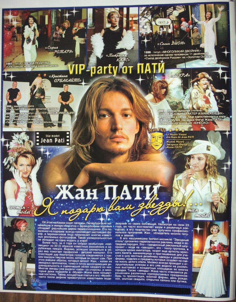 Его взлет оказался стремительным, вертикальным. Первое место на конкурсе двойников в Октябрьском – за одиннадцать образов в исполнении одного человека. Выход на подиумы – в качестве женской модели! Международная степень «ЮНЕСКО» «Универсальная имидж-модель» в рамках конкурса «Гражданин ХХI-го века» за создание «Живого музея звёздных персон Жанэ Пати».