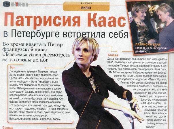 Впрочем, нам было не до лирики. Едва мы закончили историю с «Антимехом», Жани сообщил, что 22 числа в Питере будет выступать Патрисия Каас, а накануне ее концерта французская звезда дает пресс-конференцию.