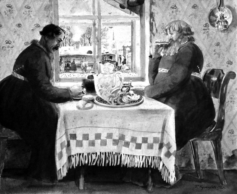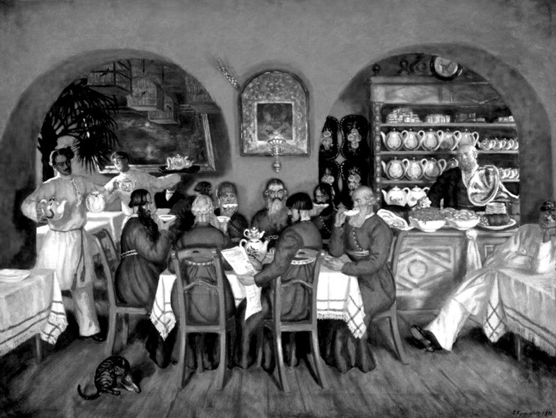 На картине Кустодиева «Московский трактир» в центре за одним столом разместилась колоритная группа, которая чинно и с достоинством вкушает чай. Судя по одежде, это ямщики-старообрядцы, устроившие себе чайный перерыв. Интересная деталь – под красным потолком в клетках можно увидеть певчих птиц, задачей которых, по всей видимости, было развлекать посетителей. Для этой же цели служит и граммофон.