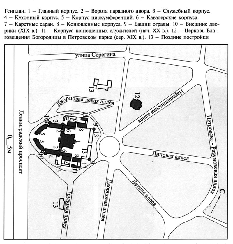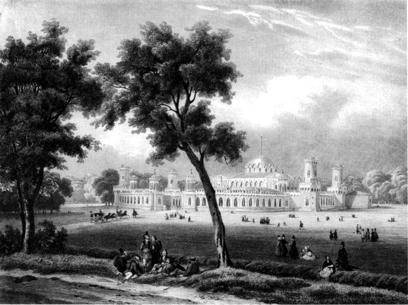 Петровский замокОдним из самых оживленных и любимых мест гуляний москвичей был Петровский парк, расположенный за Тверской заставой, у главной дороги первопрестольной, связавшей в начале XVIII века Москву и Петербург. Место это приглянулось императрице Екатерине II, лично прибывшей на празднования в честь заключения победоносного Кючук-Кайнарджийского мира с Турцией, и она заказала придворному архитектору Матвею Казакову роскошный каменный путевой Петровский дворец, по мотивам павильонов, построенных зодчим к торжествам в честь одержанной победы. Дворец был готов к 1783 году, имел два флигеля в виде крепостных стен с башнями в модном готическо-мавританском стиле. Как выразился о нем писатель М. Загоскин, это было «прекрасное здание мавританской архитектуры, переделанной на европейские нравы». Здесь была последняя остановка царского поезда для отдыха перед Москвой, когда августейшие особы приезжали в первопрестольную на коронацию или на торжества.