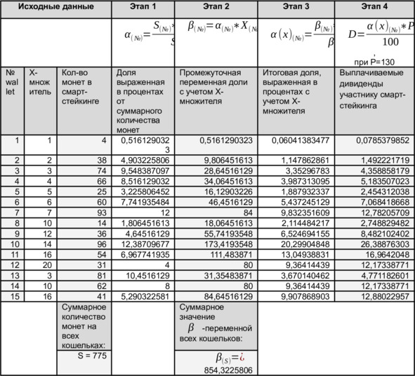 – D – дивиденды, выплачиваемые участнику смарт-стейкинга. Изначальная формула расчёта:;