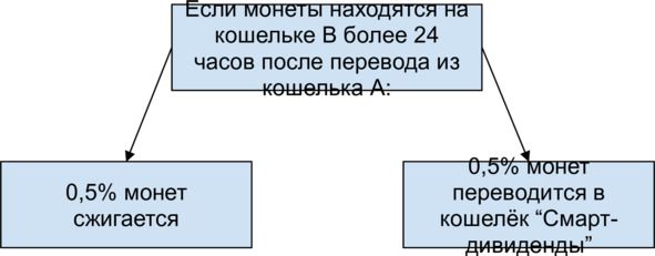 – После того как кошелёк A переводит монеты на кошелёк B, через 24 часа с кошелька B автоматически списывается 1% от полученной суммы.
