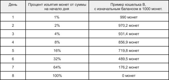 С каждым последующим днём процент изъятия увеличивается в 2 раза. Это означает, что от суммы на начало каждого нового дня будет вычитаться обновлённый процент изъятия, согласно таблице ниже.