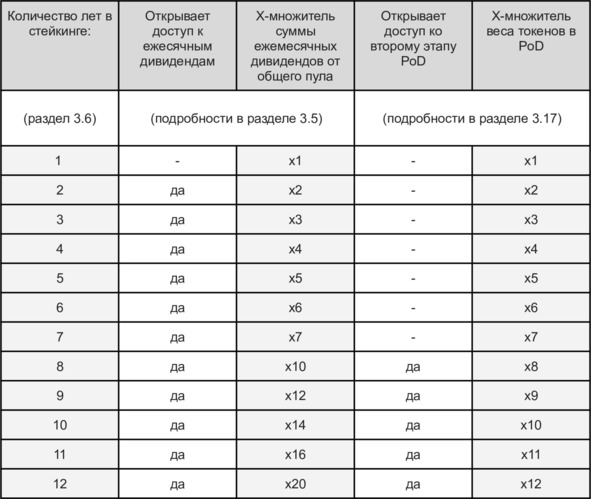 Механизм «Смарт-дивиденды» с ежемесячными выплатами активируется при стейкинге сроком от 2 лет. Когда кошелёк A вносит монеты в стейкинг на 2 года, его начальный множитель равен х2. Через год этот множитель снижается до х1 и продолжает уменьшаться ежегодно. Тот же принцип применяется и к механизму принятия решений PoD, но при других Х-множителях.