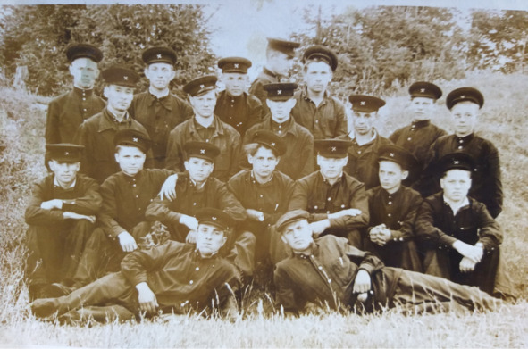 Евгений Петрович Плотников в армии (во втором ряду второй справа), первый год службы