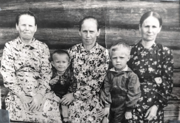 В центре на фотографии, сделанной перед войной, в 1940 году, находится жена Петра Дмитриевича, моя мать Мария Михайловна, с детьми. Мише, примерно, полтора года и Аркаше исполнилось четыре года. И две родственницы – мои тётки.