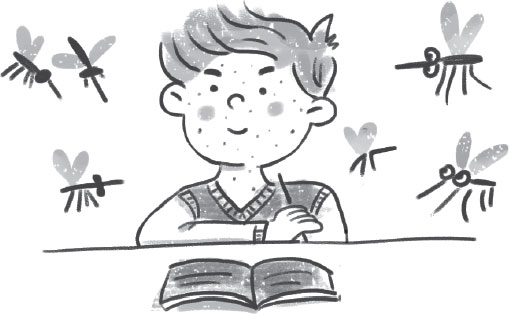 Сегодня Бобриков Ваня Мамонт вёл себя подозрительно спокойно. Может, оттого, что на его лице была куча красных прыщиков? Он сказал, что это комариные укусы, но я не поверила. Это где же надо ночевать, чтобы так искусали комары? Только в комарином гнезде или норе. Лечь лицом прямо на них и спать до утра.