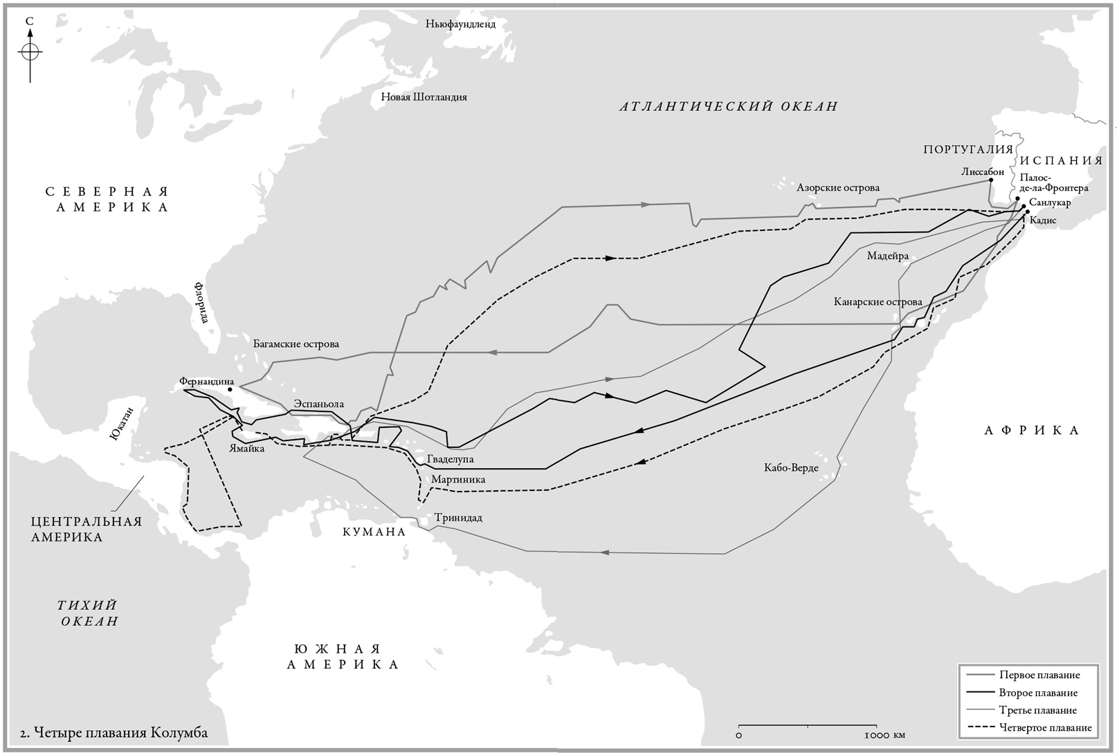 Этот не терпящий возражений тон скрывал мучительные сомнения, которые уже некоторое время мучили адмирала. Начиная примерно с 10 сентября, чтобы успокоить свою команду, которая с каждым днем все сильнее нервничала и подавала признаки назревающего мятежа, он подделывал судовой журнал, намеренно сокращая расстояние, которое прошли каравеллы. Когда 22 сентября на суда обрушился встречный ветер, он облегченно выдохнул: «Мне пришелся кстати этот противный ветер, потому что мои люди очень тревожатся, решив, что в этих морях не дуют ветры [благоприятные] для возвращения в Испанию»[60]. Это, однако, мало утешило команду, у которой были веские причины ставить под сомнение веру адмирала в «карту островов» и которая уже не раз горько обманывалась, ожидая скорой встречи с берегом. В начале октября у Колумба состоялась напряженная беседа с Мартином Пинсоном, с каждым днем испытывавшим все большее давление со стороны команды, которую в основном набирал он сам. Пинсон прекрасно понимал, что, по расчетам адмирала, к этому времени они уже должны были выйти к земле. Он уговаривал Колумба сменить курс на юго-западный в надежде найти «остров Сипанго». Поначалу Колумб отказывался, аргументируя это тем, что «лучше сперва идти к материковой земле»[61]. Если бы он в конце концов не уступил Пинсону, каравеллы унесли бы их к Флориде, и это была бы совсем другая история. В реальности же после наблюдения за полетом стаи морских птиц 7 октября Колумб взял курс на юго-запад. Наконец в два часа пополуночи в пятницу, 12 октября, когда люди были на грани отчаяния, из вороньего гнезда «Пинты» донесся истошный крик «Земля, земля!», и команды всех трех судов отреагировали на него вздохом облегчения и благодарственными молитвами Богу[62].
