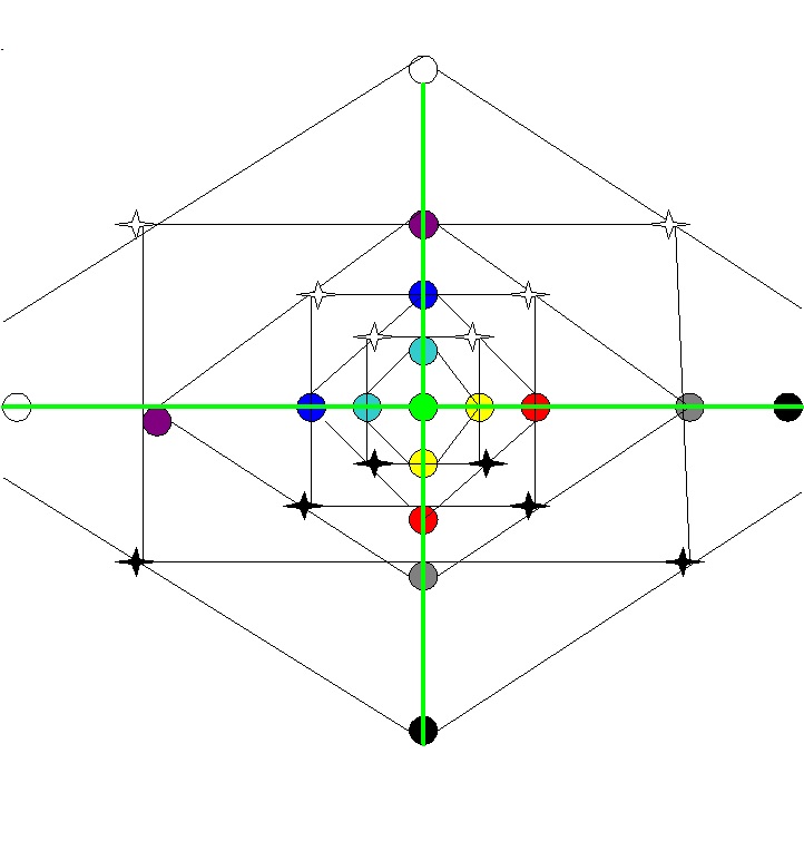 Теперь посмотрим, от чего зависит изменение способа взаимодействия с миром. Есть места пересечения треугольников, основания которых расположено на Дельта и Омега уровнях. На второй схеме соответствующие центры выделены заливкой – они расположены по вертикальной оси ближе всего к Запретной Зоне. Но эти центры могут быть наполнены разными вибрациями – в обычном случае сравнение себя с родом, человечеством, а уж тем более Вселенной только убеждает нас в своей смертности – в несовершенстве своего Дельта-тела. Отсюда два варианта – или соединиться с «целым» или попытаться разрушить его – оба эти пути нам известны и понятны. Но дело не в том, по какому из них мы движемся – оба варианта одинаково неправильны. Потому, что любой из них создает напряжение, а напряжение всегда притягивает к себе наше «я» – поэтому мы воспринимаем мир с такого уровня, на котором вообще ничего не можем увидеть. И при этом подчиняемся ему, что не позволяет нам соединить верхний и нижний центры – когда «собака» кажется нам «страшной» мы всегда ведем себя неправильно. А ещё не позволяет соединить центр Описания Мира и центр Картины Мира – все, что кажется нам Страшным, в принципе непознаваемо и мы не можем, вернее, не хотим на это смотреть. Поэтому вместо центров у нас появляются «дыры», а «дыры» всегда являются центром притяжения нашего «я». И наше сознание смещается в те точки, которые отображены на схеме ромбической структуры и которые, на самом деле, являются лишь точками воплощения наших Страхов.
