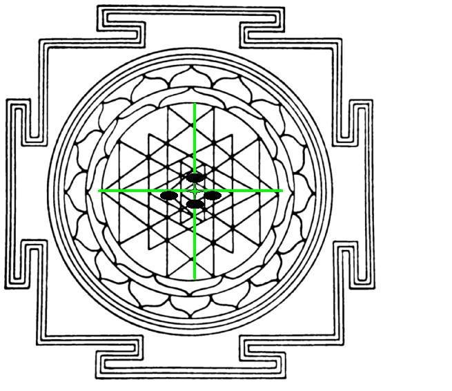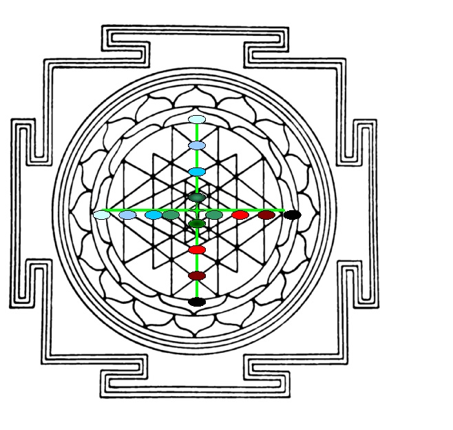 Но если наложить эту схему на уже привычную нам Шри-Янтру, картина меняется почти на противоположную. – «центры», связанные с Пределами реальности остаются на своих местах – равно как и центры, связанные с Тэта-Гамма уровнями. А «шары» Альфа-Бета и Омега-Дельта уровней меняются местами – первые отдаляются от центра, а вторые приближаются к центру.