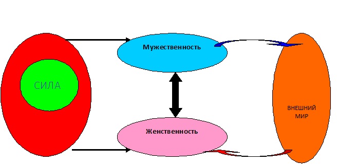 Здесь есть один важный момент. Обычно МУЖЕСТВЕННОСТЬ мы воспринимаем как СИЛУ, а ЖЕНСТВЕННОСТЬ как СЛАБОСТЬ. На самом деле речь идет о расщеплении одного и того же качества на две половины.