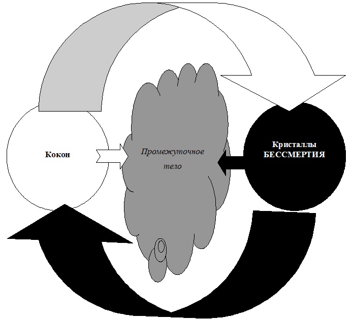 Несовершенство нашего тела непосредственно связано со «светимостью» нашего кокона. Мы уже говорили о том, что любой объект может существовать и в виде поля, и в виде плотного тела. Но обычно он существует в промежуточном состоянии, в котором энергия поля используется для восполнения несовершенства плотного тела и наоборот. В этом состоянии «материя» и «дух» неразделимы, вернее, при разъединении они сразу же начинают разрушаться. С этой точки зрения любой объект, в том числе – и наше тело, представляет собой соединение трех элементов: «чистой энергии» – кокона; «чистой материи» – «кристаллов бессмертия», и «промежуточного» тела, в котором тонкие и плотные оболочки соединены воедино. Все эти элементы образованы одной и той же энергией, поэтому, чем несовершеннее тело, тем больше энергии находится в связанном состоянии.