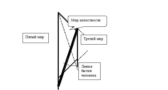 Пунктирная линия отображает обратный наклон линии бытия человека, при котором накопленная человеком (но не осознаваемая им) энергия впечатлений передаётся тем силам ВЕРХНЕГО ПРЕДЕЛА, которые могут использовать её для своего развития.