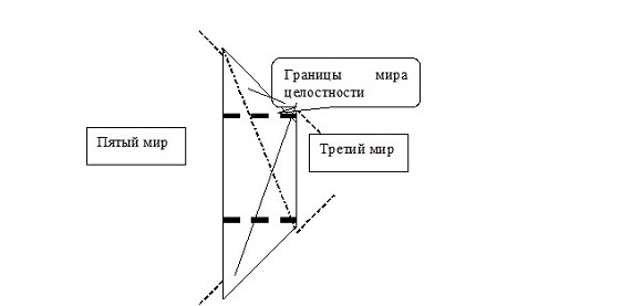 Когда я говорил об уровнях реальности, я упоминал о том, что каждый последующий уровень включает в себя все предыдущие. С этой точки зрения законы каждого мира действуют только в некой зоне, прилегающей к пределам реальности, в остальной же зоне сохраняется действие законов предыдущего мира. То есть границы мира целостности в действительности выглядят следующим образом: