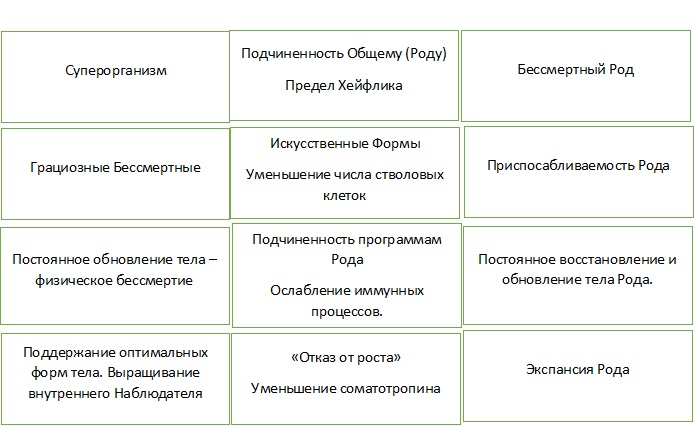 Поэтому тимус у человека перестает функционировать уже к 30 годам, а тело утрачивает способность очищаться от старых клеток даже раньше, чем эта способность оказывается востребованной. А «общий тимус» не только сохраняет, но и усиливает эту способность – Род может очищаться от старых особей достаточно эффективно – процессы старения и смерти являются как раз проявлением его действия.