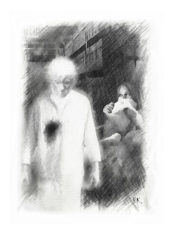 В тот же миг сквозь белую ткань одежды у юношей стали проступать кровавые пятна. Это было жуткое зрелище. Одежда незнакомцев стремительно окрашивалась в красный цвет, а она смотрела, боясь отвести взгляд в сторону. Девушку охватила паника.