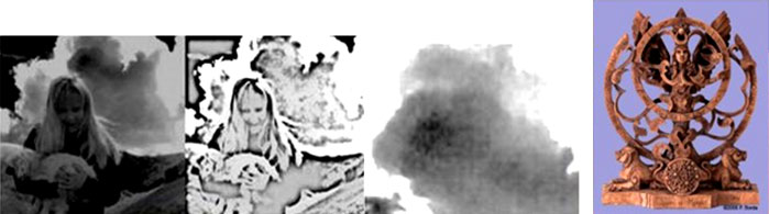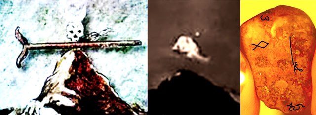 Н. К. Рерих. Картина Победа. Сибирское отделение Академии наук Новосибирск. Она о главной Победе на земле. На его картина энергия мысли воина соединилась с мыслью Бога, и змей был повержен. Картина Н. К. Рериха вне сомнений – пророческая. На склоне гор на ней виден Владыка Шамбалы. Рядом с картиной – фрагмент моей фотографии. «Подними камень – я в нем», сказал ХрИсТОс (Хор, Исида, Тот, Осирис). На фоне горы Шамбалы видимы (проявлены водой) Хор – Христос и Владыка Шамбалы.