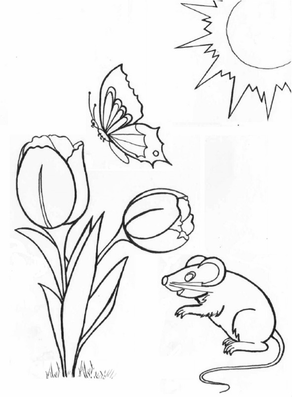 А утром встало солнышко, пригрело землю своими тёплыми лучами. Всё вокруг ожило. Цветы на клумбе раскрылись навстречу солнцу. Прилетели трудяги пчёлки, бабочки летают с цветка на цветок… и мышонку на нос.