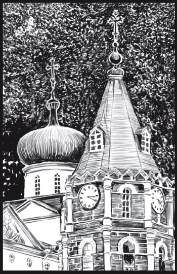 Подъёмы и спуски чередовались ещё пару раз, вскоре лес стал понемногу редеть. И вот, наконец, на фоне свинцовых облаков нарисовались кресты Покровского собора.