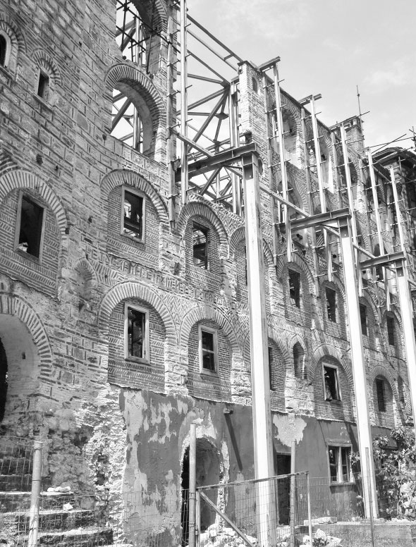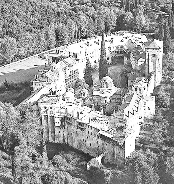 …Гравийная дорожка постепенно перешла в мощённую булыжником, которая довела нас до ворот Хиландара. Здесь всё ещё дышало гарью страшного пожара, несколько башенных кранов сиротливо застыли над полуразрушенными строениями. Тем не менее монастырь продолжал жить размеренной жизнью, несмотря ни на что. Видимо, многовековое житие под игом генным кодом передалось потомкам, которых не могут сломать никакие обстоятельства.