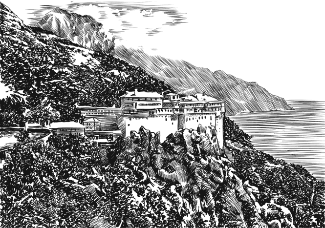 * * *На юго-западном склоне Святой Горы, являясь чудесным рукотворным продолжением высокой отвесной скалы, расположился монастырь Симонопетра (Σιμωνόπετρα), тринадцатый в современной иерархии афонских обителей. Хотя согласно III Типикону он занимал всего лишь двадцать третье место среди монастырей Афона тогдашней эпохи.