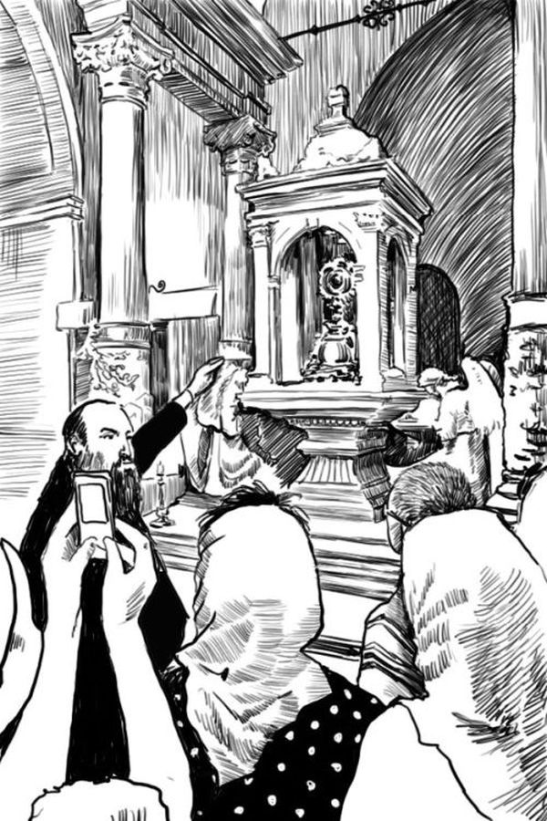 Тщетно пытался отец Василиан восстановить веру и мир в душе. Меж тем, пресуществление произошло. Со словами молитвы он преломил Евхаристический Хлеб, и небольшую церковь огласил крик изумления. Под пальцами иеромонаха преломлённый хлеб превратился во что-то другое, и он не сразу понял, во что именно. Да и в Чаше было уже не вино – там была густая алая Жидкость, похожая на кровь.