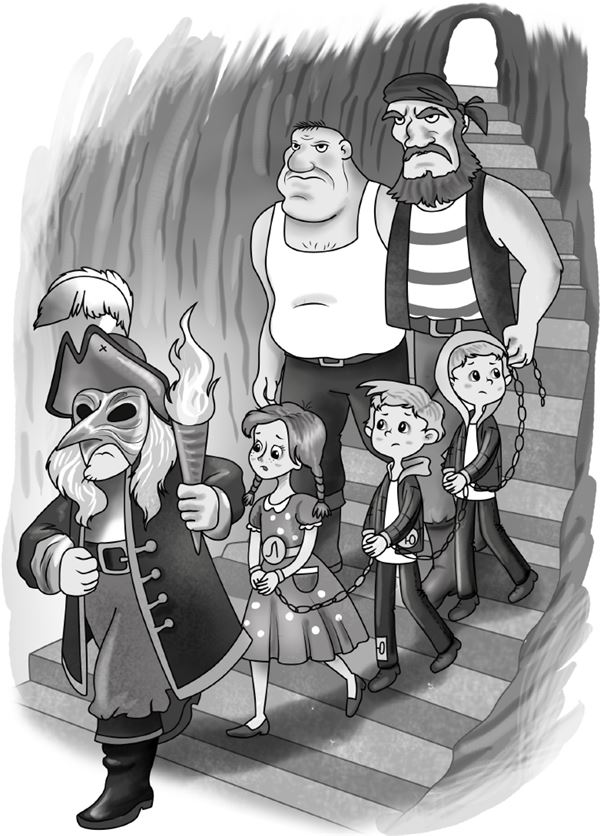 Тем временем правитель уже прибыл во дворец и спускался в подземелье. Рядом с ним шли двое охранников. Они вели скованных одной цепью Лялю, Юлика и Юла. Дети очень устали в трюме пиратского корабля, на котором их сюда привезли, и еле волочили ноги. Открыв громадным ключом железную дверь, правитель толкнул их в темноту подземелья.