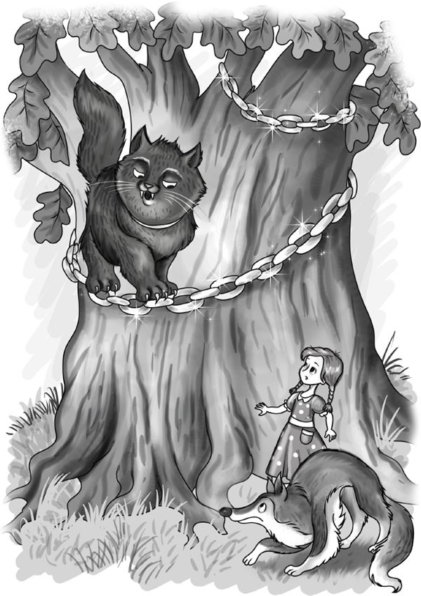 Из-за дуба, с правой стороны, вышел по цепи громадный Кот и церемонно поклонился девочке, если только можно представить себе кланяющегося кота. Нет, он был вовсе не чёрным, как его рисуют на картинках к сказкам Пушкина. Он был ослепительно белым и необыкновенно пушистым. Таким пушистым, что Лёле захотелось немедля его погладить. Кот подсунул ей под руку свою большую голову, взглянул на неё незабудковыми глазами, довольно замурчал и двинулся по цепи дальше.