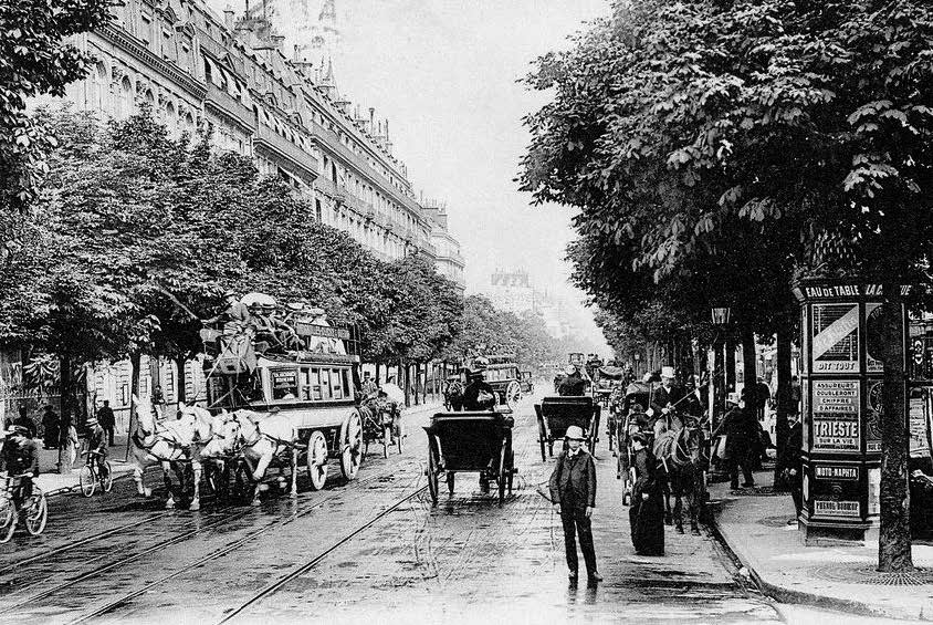 На больших бульварах и Елисейских полях царило небывалое оживление, здесь находилось много известных магазинов, театров и кафе. На бульваре Капуцинов открылся мюзикл-холл «Олимпия», а в «Гран кафе» братья Люмьер впервые продемонстрировали свое изобретение — движущиеся фотографии. Они создали аппарат, который назвали кинематографом. Такие же киносеансы, организованные Эженом Пиру (конкурентом братьев Люмьер), проходили в легендарном ресторане «Кафе де ля Пэ», близ оперы.