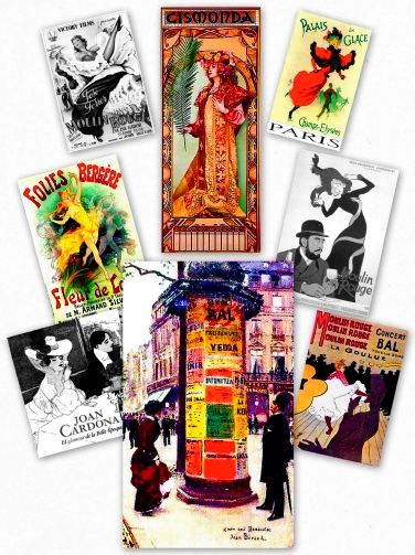 Афиши, расклеенные на тумбах по всему Парижу, приглашали на новые театрализованные постановки, карнавалы и концерты с балами. Французы превратили рекламу — плакаты и афиши — в произведения искусства, которые родили своих звезд: Муша, Тулуз-Лотрека, Шере, Вийета… Театральные афиши Тулуз-Лотрека невозможно забыть. «Величайшим в мире художником декоративной живописи» назовут в то время художника Альфонса Муху. В первые дни 1895 года на рекламных тумбах Парижа появляется его новая афиша, представляющая постановку византийской мелодрамы «Жисмонда», где главную роль исполняла знаменитая Сара Бернар, о которой писатель Поль Моран сказал: «В 1900-х годах в Париже жизнь была театром, и этим театром была одна Сара Бернар».