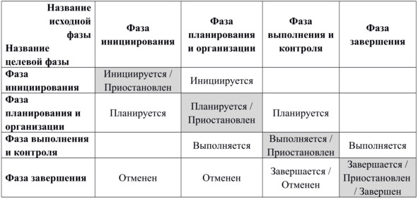 Фазы управления проектом реализуются последовательно и итерационно повторяются при переходе от одной фазы реализации проекта к другой. Прохождение всех фаз управления проектом на одной фазе реализации проекта образует цикл управления фазой реализации проекта. В зависимости от текущей фазы управления проектом выполняется определенный набор операций управления по каждой предметной области управления. В случае возникновения изменений ключевых показателей проекта возможен возврат на одну из предыдущих фаз управления проектом. При изменении фазы управления проектом изменяется состояние проекта (характеристика степени завершенности проекта). Возможные варианты изменения состояний проекта представлены в Табл. 1.1.