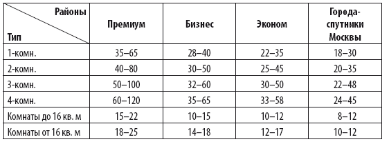 Прежде чем рассматривать основные схемы сдачи квартирной недвижимости, давайте, уважаемый читатель, разберемся с ценовой ситуацией, которая сложилась на этом сегменте рынка (на примере московского региона). На сегодняшний день (середина 2015 г., прим. ред.) существуют три основных стоимостных диапазона сдаваемого жилья: первый – квартиры эконом-класса до 50 тыс. руб/мес; второй – бизнес-класс 50–80 тыс. руб/мес; третий – премиум-класс от 80 тыс. руб/мес.